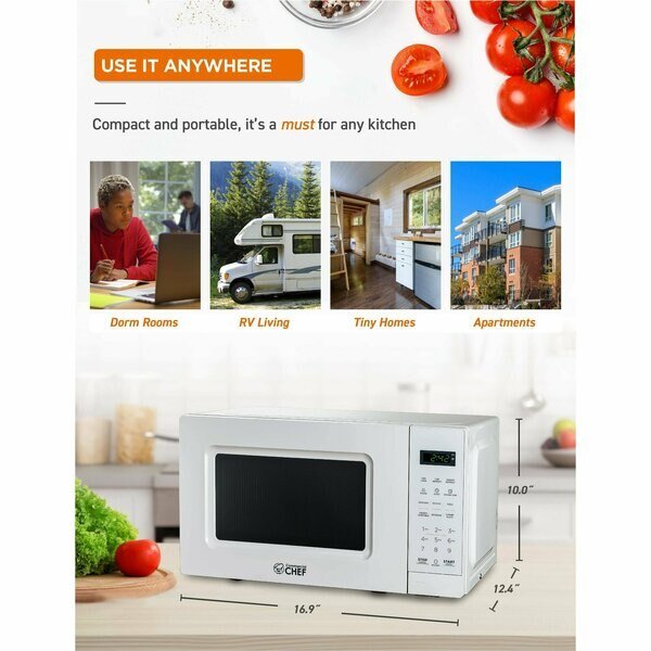 Heat and re-heat your favorite foods and beverages with this outstanding COMMERCIAL CHEF microwave oven countertop. With an impressive capacity of 0.7 cubic feet, this 0.7 microwave ensures you can grab and go with delicious meals. Our fantastic microwave black 16.9 12.4 10.0 will fit easily on kitchen countertops in homes, apartments, RVs, dorms, and more. Weighing only 19.8 lbs., you can transport this portable microwave anywhere so heated food and drink is within reach. This small microwave oven has impressive power levels such as Time Cook, Time Defrost, Weight Defrost, & Power. Preset Menu Options include Popcorn, Potato, Pizza, Frozen Vegetable, Beverage, & Dinner Plate. Also included on the digital display is Clock & Kitchen Timer. Our small countertop microwave will heat from as little as 30 seconds to as long as you desire! Additional features include a door-style push button, 700 watts of power, an efficient turntable that guarantees even heating, child safety lock, yellow & green LED lighting, and sleek black plastic design. What's not to love about this COMMERCIAL CHEF microwave 0.7 cu ft? Its reliable heating ability, impressive functions & settings will have you heating and re-heating throughout your busy day!