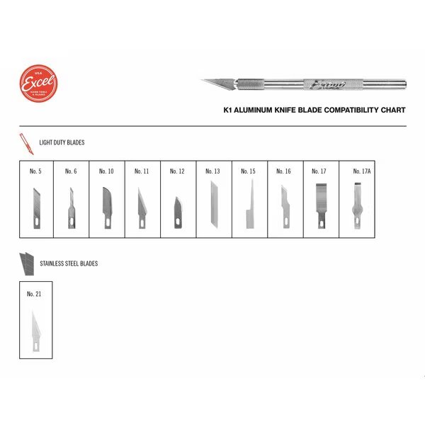 Both professionals and hobbyists, rejoice! The Excel Blades' Excel Blades #1 Knife: Precision Knife for Hobby, Art, and Craft with 5 Blades is set to become your next favorite tool! Our best selling paper cutter features an aluminum body knife with a 4 jaw machined chuck to secure blade, includes 6 total blades and a snug fitting safety cap for your protection,and makes it easy to cut through a variety of materials, including paper, fabric, and cardboardThe item # 19001 is made of aluminum and carbon steel. This products works in conjunction with light duty blades: 05, 06, 10, 11, 12, 16, 17, 17a, & 21.