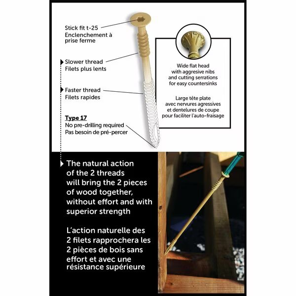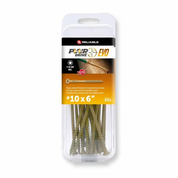 Power Drive is the New Premium line of screw products from Reliable. The PWR Drive EVO is the general construction screw from that line, used for decking, fencing or any framing applications. This screw has all the bells and whistles available today: Type 17 to prevent splitting, 3 level of under head nibs for the cleanest finish ever produced and a T-25 no slip sticky drive. The biggest difference of the EVO is its second thread. This thread being slower than the first one will produce a clamping effect simply impossible to obtain with any other screw on the market today. Plus, the EVO #10 x 5 and #10 x 6 in. with its very special thread design is especially designed for toe screwing assemblies angle very common in framing and has to be one of the most innovative ideas to hit the fastener market in the past 15 years. All EVO screws come with the same corrosion resistant coating that is used on our structural screws that is certified compliant with the IBC and IRC building codes. Watch the video and see the difference.