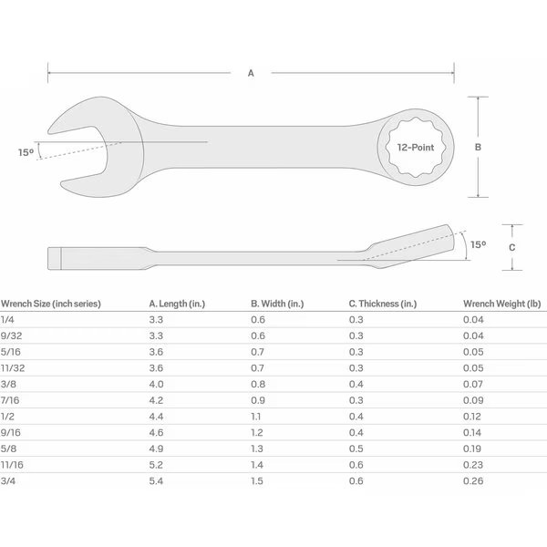 | Features | With a short length and slim body, this TEKTON Stubby Combination Wrench is easy to operate when there's not much room to work. |