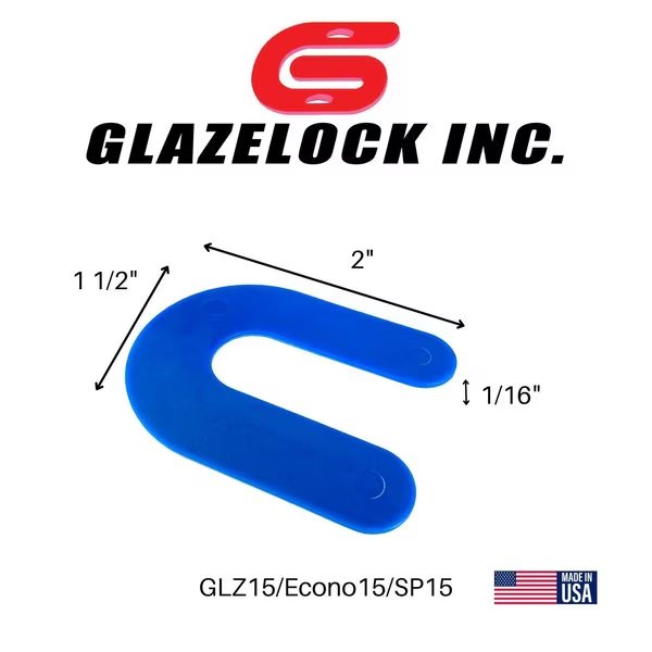 1/16" 2"L x 1 1/2"W 1/2" Slot, U-shaped Horseshoe Plastic Flat Shims Blue 100pc/bag, Glazelock, Mfr#: Econo15
