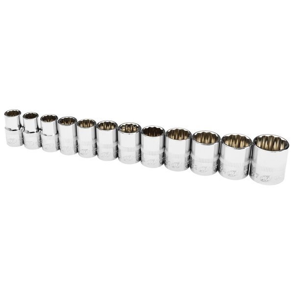 Ingersoll Rand® 12-point shallow sockets are constructed of industrial-grade Chrome Vanadium steel that exceeds ANSI standards. Each socket is finished with mirror-polished chrome plating. Ingersoll Rand® signature vertical knurling offers better grip and easier handling (especially with greasy hands). The set includes a heavy-duty storage case with snap closures and a hang tab for pegboard storage. • METRIC SIZES: 12, 13, 14, 15, 16, 17, 18, 19, 21, 22, 24, 27 MM • PREMIUM MATERIALS: Mirror-Polished Industrial-Grade Chrome Vanadium Steel • EASIER HANDLING: Vertical Knurling Offers a Better Grip • INCLUDES: Heavy-Duty Storage Case with Snap Closures and a Hang Tab for Pegboard Storage • QUALITY BUILT: Exceeds ANSI Standards for Torque, Fit and Finish • COLOR: Mirror Polished Chrome Plated Finish • MATERIAL: Chrome Vanadium Steel Material