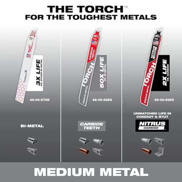 The MILWAUKEE® TORCHTM with NITRUS CARBIDETM for Conduit, Strut, and other medium-thickness metals delivers the fastest cutting, and longest life with a breakthrough Carbide Technology. These NITRUS CARBIDETM reciprocating saw blades are engineered to dissipate heat better than any other demolition blade for faster cutting. The TORCHTM with NITRUS CARBIDETM for Medium metals delivers 2x life versus carbide teeth blades in rigid metal conduit. This 10TPI SAWZALL® blade is ideal for smooth, fast cuts and enhanced durability in conduit, strut, angle iron, and Stainless Steel.