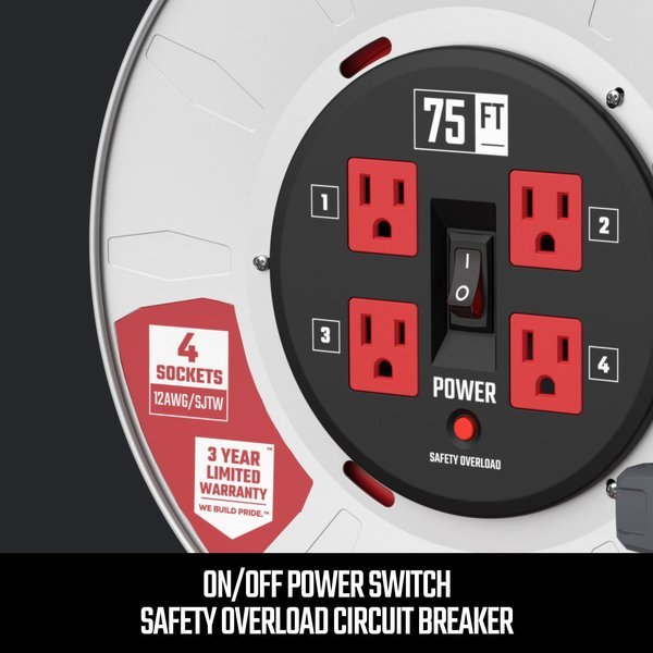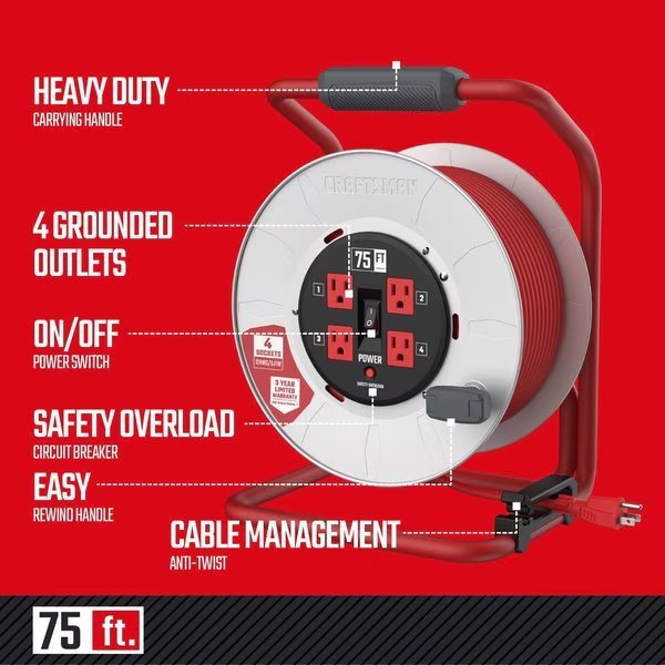 Always supply the power you need while working outside with this Extension Cord Reel with Outlets from CRAFTSMAN! This convenient retractable electric cord reel features a 75-foot, 12AWG cable that makes it ideal for large outdoor spaces and providing heavy-duty power to equipment and tools. It includes a built-in circuit breaker with overload protection, which will automatically go off when the rated current or voltage is exceeded to protect your devices.