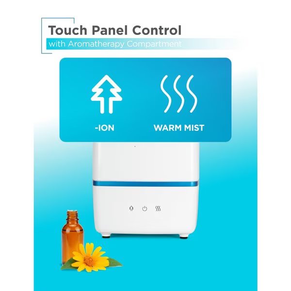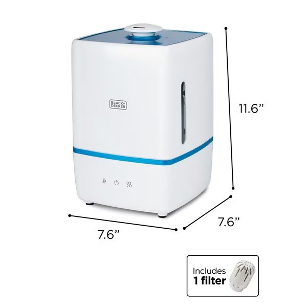 Our BLACK+DECKER humidifier provides dry air relief for soothing comfort with the added benefit of warm mist option and aromatherapy. Warm mist provides faster humidification needed for cold winter months. Fill your room with your favorite essential oils while enjoying the humidifiers mist. This ultrasonic humidifier has a 1.32 gallon/5L water tank capacity and offers a continuous run time of 28 hours per filling on minimum speed on cool mist and up to 24 hours on warm mist. This cool & warm mist humidifier is great for rooms up to 550 square feet. This diffuser humidifier also features a touch panel control for ease of use and a Negative Ion function that effectively fights pollutants and improves air humidification. Our air humidifier has a 360-degree rotational mist outlet to direct mist where you need it. Auto shut off when tank is empty. Water level indicator. Molded plastic housing. Includes 59 power cord with 2-prong/Type A plug. 110 watts. Includes one Ceramic Infused filter. Measures 7.6 x 7.6 x 11.57. Weighs 4.05 lbs. UL listed.
