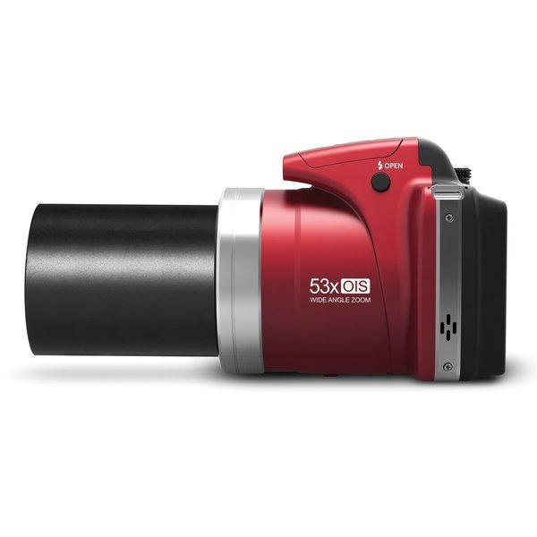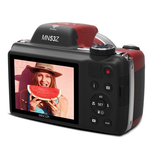 Minolta’s 16.0-Megapixel 53x Zoom Bridge Camera in Red features a 16 megapixel hi-resolution sensor for crystal clear still images and 1080p full HD videos. The 53x optical zoom auto-focus lens provides a focal length of 24 mm to 1256 mm, covering wide-angle to super telephoto. Optical image stabilization, 3 in. 460k LCD, and a broad array of shooting modes make it easy to capture that ideal shot. User-friendly features like face, smile, and blink detection make it easy to capture the ideal photo and a variety of 14 scene modes including night portrait, panorama, and sunset make it simple to shoot in any setting possible. With built-in Wi-Fi you can use your smartphone as a remote shutter and transfer your media for sharing. It is SDHC expandable to 32 GB and features built-in speakers for non-stop shooting.