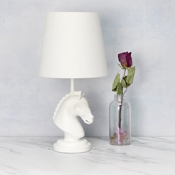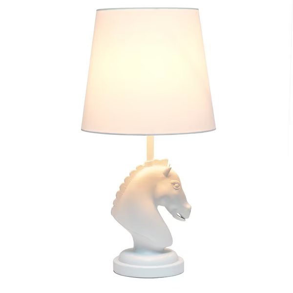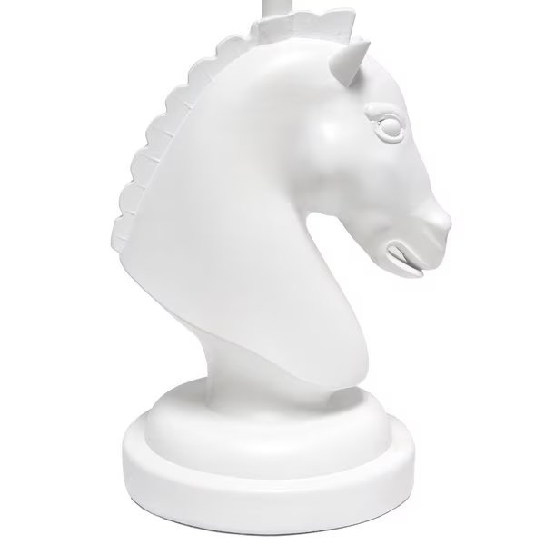 - •UNIQUE LAMP STYLE: Fun, stylish, and unique! A lovely horse shaped base in white stands on a matching round base and sits beneath a crisp white fabric shade made of linen.