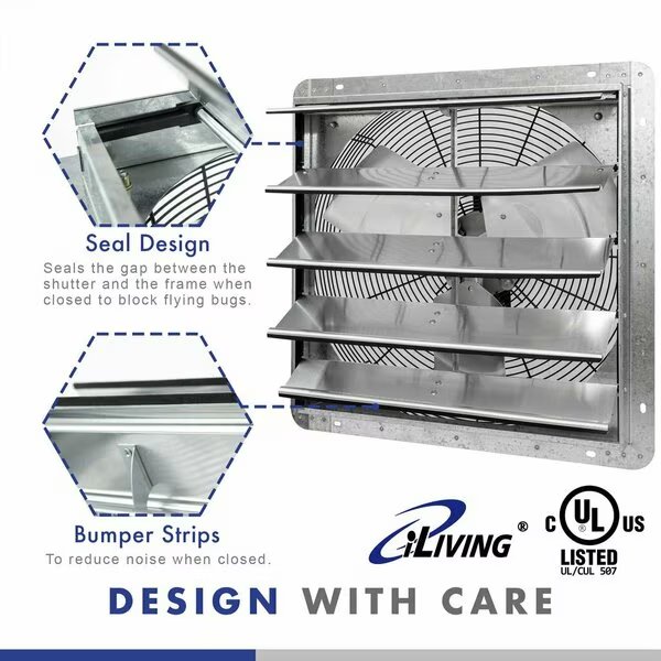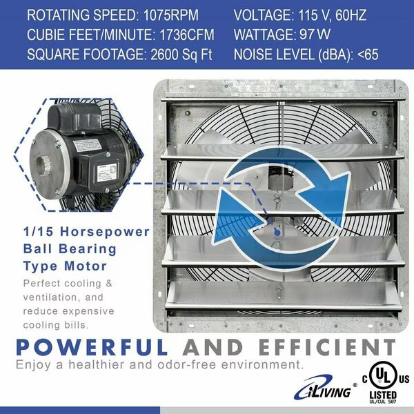The iLIVING Shutter Exhaust Fan is perfect for removing excess heat, moisture, and unpleasant odors from virtually any commercial location, including restaurants, factories, warehouses, barns, and greenhouses. This fan features aluminum blades, OSHA compliant wire guards, and automatic shutters that open and close in tandem with the operation of the fan. The completely enclosed motor is thermally protected and permanently lubricated. Equipped with the newest Thermospeed Controller which can easily control the temperature and speed. Auto cycle ON/OFF at your desired temperature. The fan comes fully assembled out of the box.