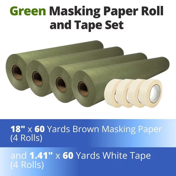 IDL Packaging Masking Kit includes: 4 Rolls of Premium Green Long Masking Paper, 18 inches x 60 yards; 4 Rolls of GP Masking Tape, 1.41 inches x 60 yards.If using oil-based materials commonly used in the automotive industry, we recommend applying PREMIUM Green Paper for masking necessary areas. Green Masking Paper has a better oil resistance compared to GP brown masking paper and protects the surface from any drips.Masking tape is an extremely useful piece of equipment used in stencil painting, carpentry work, and a wide range of other applications. Use this tape for better adherence of the masking paper to any surface.Sure, you can only use paper rolls for surface protection. But, for paper securing results, you should use masking tape as well. And, for convenience covering the entire area, use the TH-120 Hand Masking Paper/Tape Dispenser. It simplifies all operations and helps to get the dreary work done without extra effort. To make your purchase easy, we collected the most popular kits of masking products. You can choose any of them suit your project.Thank you for choosing our products and good luck with your project!