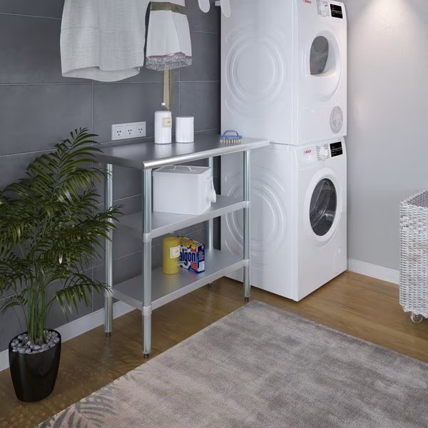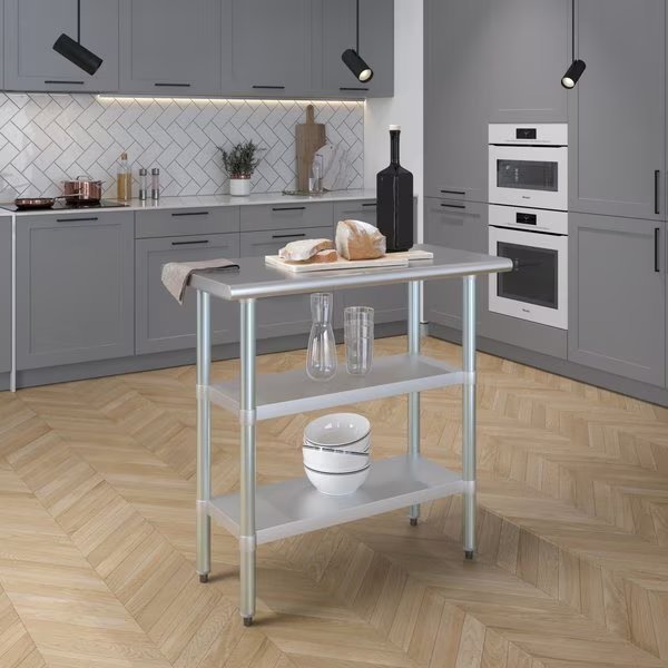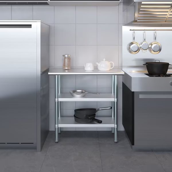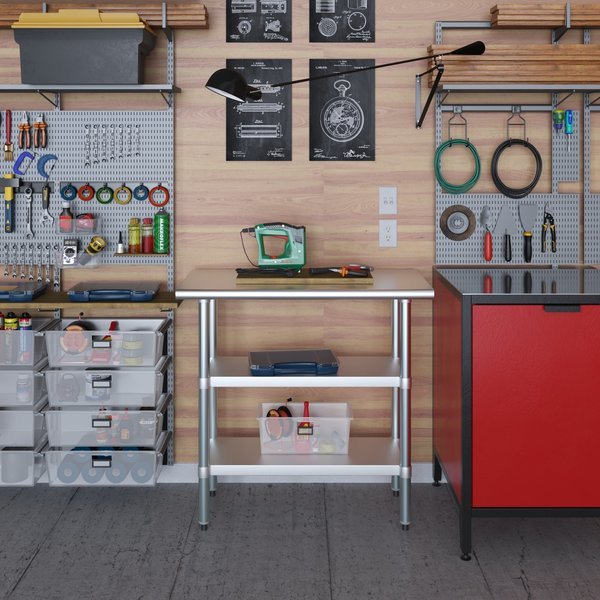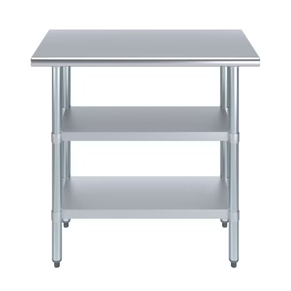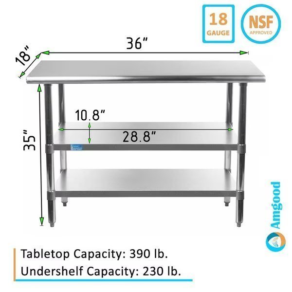 Stainless Steel Work Table With 2 Galvanized Under ShelvesCommon Applications:Food Prep Table For Commercial KitchenKitchen IslandCounter ExtensionUtility Bench for ShopProfessional Work StationGarage Work BenchLaundry Clothes Folding TableBrewing SetupExam Table For VeterinariansButcher ShopProduct SpecificationsStainless steel worktable surface has curved edges for safety and comfort. It incorporates a heavy duty adjustable galvanized under shelf and leveling feet.18 Gauge 430 Stainless Steel Top2 Galvanized Adjustable Under ShelvesAdjustable feet to compensate for uneven floorAdjustable under shelf - great for storageHeight: 35NSF CertifiedSturdy & easy to setupHeavy DutyAmGood Supply prides itself of being a one stop shop for all of your restaurant supply needs.AmGood Supply offers a wide selection of stainless steel work tables with galvanized legs and undershelf.All work tables are made with T-430 18 gauge stainless steel, designed to be easily assembled, and are NSF certified.Stainless steel work tables are commonly used for food prep in a commercial kitchen, as a work desk, assembly line table, work bench, and in many other residential, commercial and industrial applications.AmGood Supply work tables are known for their premium quality and economy prices.