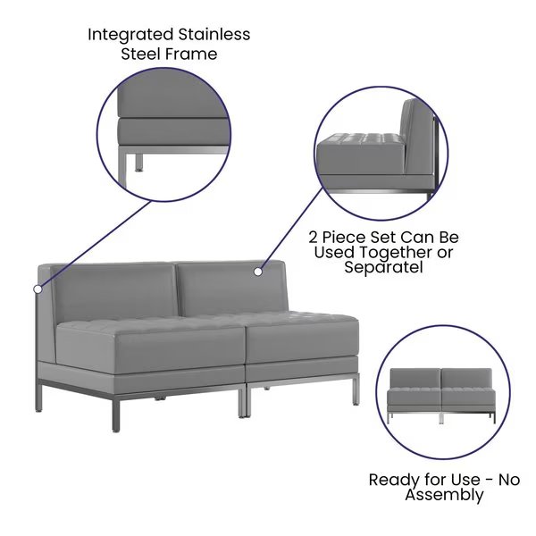 Your lobby or reception area is the forefront of your business and providing distinguished and comfortable seating is the first step towards making a great impression. Welcome your clients, customers and guests with this lovely gray LeatherSoft upholstered lounge set. LeatherSoft is leather and polyurethane for softness and durability. The striking stainless steel legs and frame lend an air of sophistication to this modular set to make it stand out. Featuring a taut back and biscuit tufted seat this reception seating group will add elegance to any decor. Thickly padded cushions with CAL 117 fire retardant foam, and a low back design will keep visitors relaxed and comfortable while they wait. Perfect for waiting room use, these chairs provide optimum support for long hours of sitting. This lounge seating set will seat up to 2 people and spills clean up easily with a solvent based cleaner, no water needed. This collection offers modular pieces that will allow you to reconfigure the space to accommodate your guests as your business grows. Purchase this complete set and add on any additional pieces now or later to make your waiting room, hotel lobby or hospitality area the best it can be.