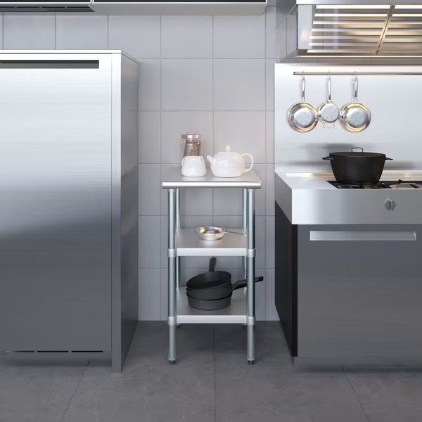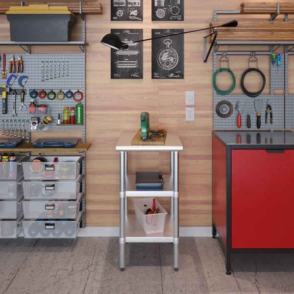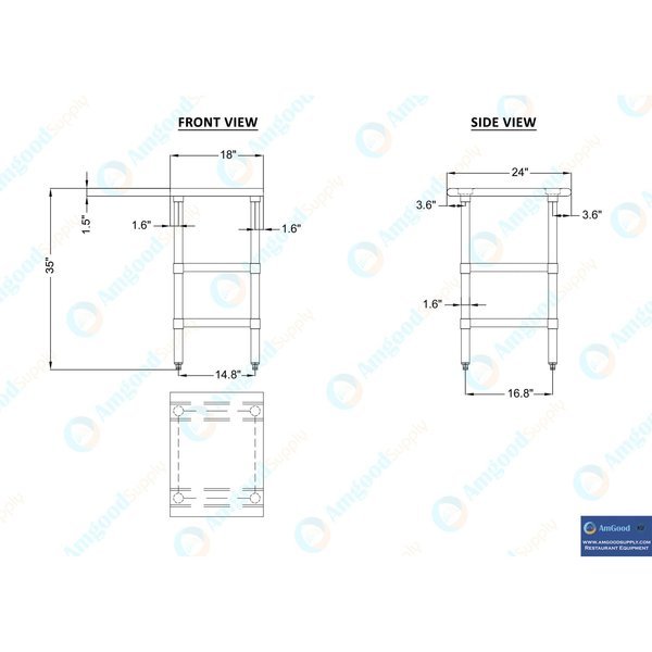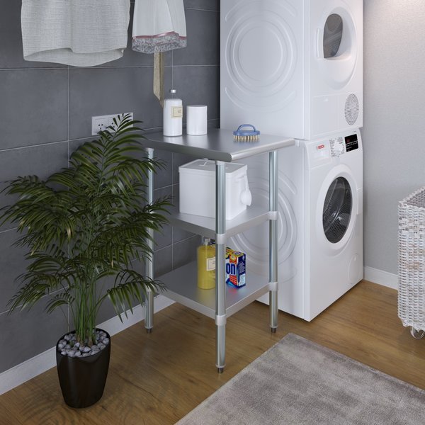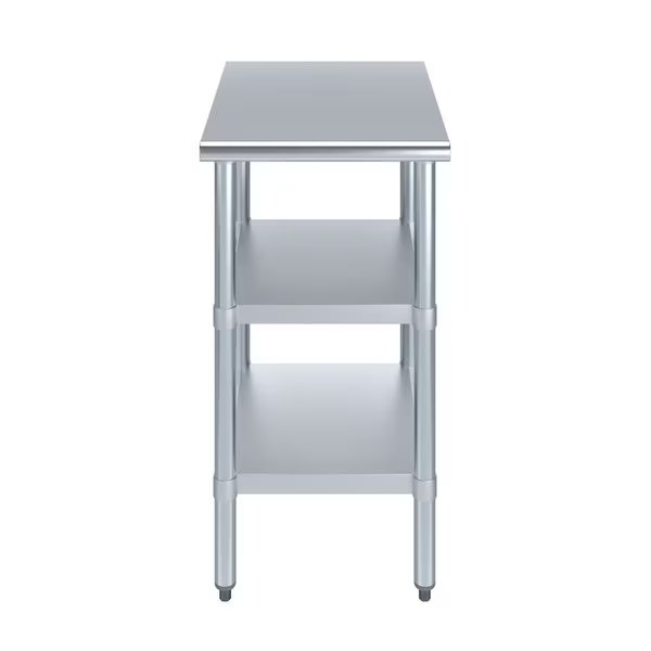 Stainless Steel Work Table With 2 Galvanized Under ShelvesCommon Applications:Food Prep Table For Commercial KitchenKitchen IslandCounter ExtensionUtility Bench for ShopProfessional Work StationGarage Work BenchLaundry Clothes Folding TableBrewing SetupExam Table For VeterinariansButcher ShopProduct SpecificationsStainless steel worktable surface has curved edges for safety and comfort. It incorporates a heavy duty adjustable galvanized under shelf and leveling feet.18 Gauge 430 Stainless Steel Top2 Galvanized Adjustable Under ShelvesAdjustable feet to compensate for uneven floorAdjustable under shelf - great for storageHeight: 35NSF CertifiedSturdy & easy to setupHeavy DutyAmGood Supply prides itself of being a one stop shop for all of your restaurant supply needs.AmGood Supply offers a wide selection of stainless steel work tables with galvanized legs and undershelf.All work tables are made with T-430 18 gauge stainless steel, designed to be easily assembled, and are NSF certified.Stainless steel work tables are commonly used for food prep in a commercial kitchen, as a work desk, assembly line table, work bench, and in many other residential, commercial and industrial applications.AmGood Supply work tables are known for their premium quality and economy prices.