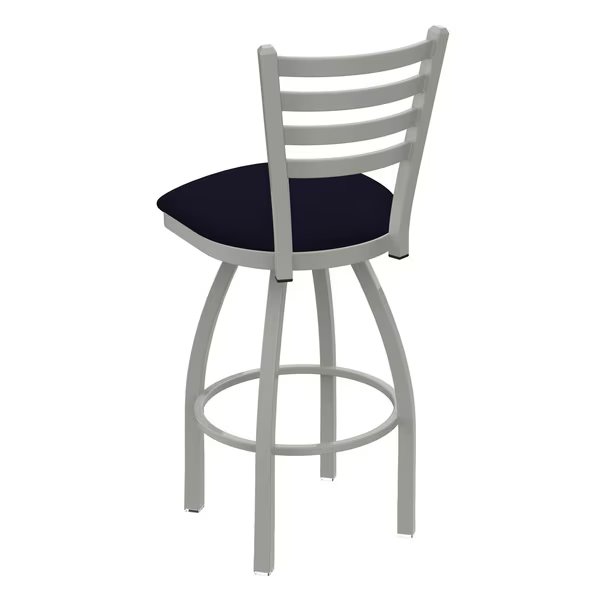Customize your very own counter stool with the help of the Holland Bar Stool Co. This Anodized Nickel Jackie swivel counter stool has a contemporary design and provides superb back support for exceptional comfort. The frame is made from commercial quality 16 gauge, 1 1/4 inch tube steel with solid mig welded joints to guarantee strength and durability. The powder coated finish resists chips and scratches and ensures a long-lasting, rich appearance. The wood seats are 1 1/4 inch solid hardwood (oak or maple) and are dished for amazing posterior comfort, making sitting for minutes or hours a pleasure. The cushion seats are of the highest quality as well, utilizing a breathable, commercial grade vinyl or fabric. At the heart of the cushion is 2 1/2 inches of highly-dense foam that provides maximum support and will not breakdown in a couple years. You won't find a higher quality stool on the market. If you are going to finish your bar or dining area - do it right, with a stool from the Holland Bar Stool Co.