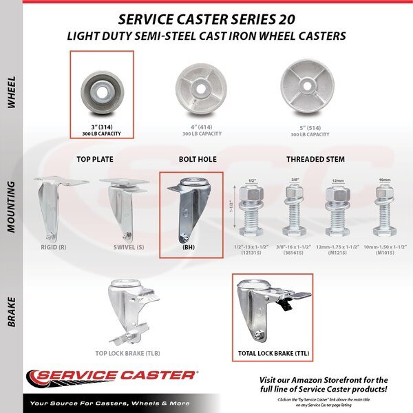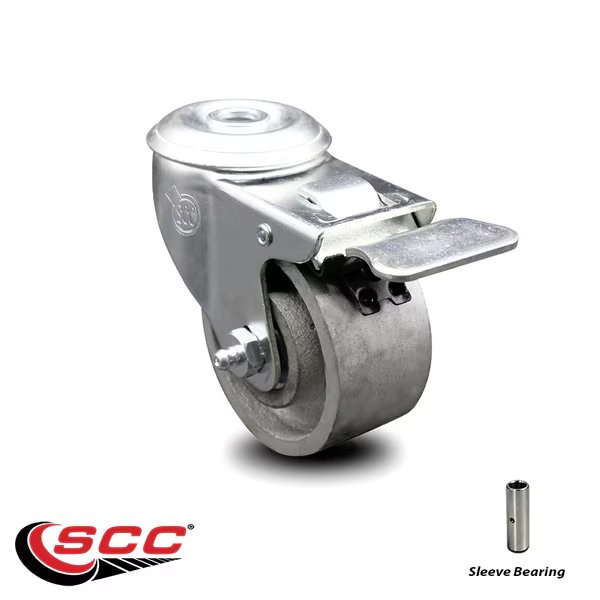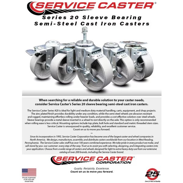 Listing is for one (1) Service Caster Series #20 swivel caster with a 3" diameter by 1-1/4" wide semi steel cast iron wheel and a bolt hole with total lock brake capable of supporting 300 lbs./caster.When searching for a reliable and durable solution to your caster needs, consider Service Caster’s Series 20 sleeve bearing semi-steel cast iron casters. The Service Caster Series #20 is ideal for light and medium duty material handling, carts, equipment, and shop projects. The zinc plated finish provides durability under any condition, while the semi-steel wheels are abrasion resistant and rugged, maintaining effortless rolling under heavier loads, and provides a cost-effective solution over steel wheels. Sleeve bearings provide a metal sleeve inserted in a wheel to rest directly on the axle. This option is only recommended when rolling ease is less critical. Mounting options include top plate, bolt hole and standard and metric threaded stem sizes. Service Caster is unsurpassed in quality, reliability, and excellent customer service. Count on us to move you forward.