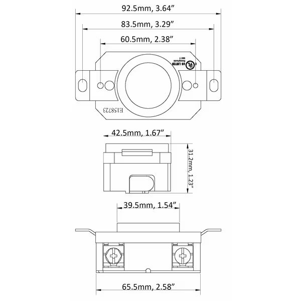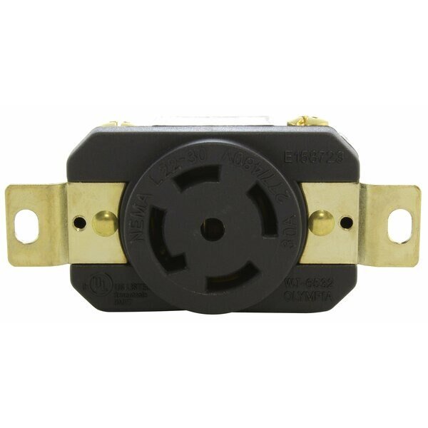This AC WORKS brand female receptacle features a 4-pole, 5-wire grounding system. It is a NEMA L22-30R, 30 Amp, 277/480 Volt flush mount locking outlet. This product is installed to repair or change a receptacle. It features chemical and impact-resistant housing along with a quick installation process. The FML2230R is UL and C-UL certified.