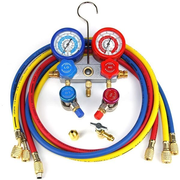 PACKAGE INCLUDED: Multicolored set of three 3-layers hoses, Manifold Gauge Set, Vacuum Pump Oil Bottle, Accessories of Quick Couplers and ACME Adaptors, Ready-to-Work Full Complete Tool Kit