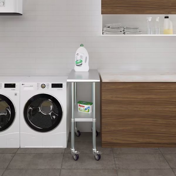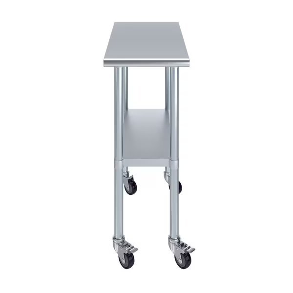 A Stainless Steel Utility Work Table with Wheels is a great addition to any home or business. It is perfect for a variety of tasks, including a workbench, prep table, or general-purpose table. The included bottom shelf provides additional storage space. Some assembly is required.NSF certification allows the table to be used in any food service environment.The table is made with corrosion resistant 430 stainless steel top and galvanized legs and bottom shelf. It's built to withstand heavy use and everyday wear and tear. Whether you need a sturdy workspace for your next DIY project or simply want an extra prep area in the kitchen, this utility table has you covered.Common Applications:Food Prep Table For Commercial KitchenKitchen IslandCounter ExtensionUtility Bench for ShopProfessional Work StationGarage Work BenchLaundry Clothes Folding TableBrewing SetupExam Table For VeterinariansButcher ShopProduct SpecificationsMobile stainless steel work table surface has curved edges for safety and comfort. It incorporates a heavy duty adjustable galvanized bottom shelf and leveling feet.18 Gauge 430 Stainless Steel TopGalvanized Adjustable bottom shelfAdjustable feet to compensate for uneven floorAdjustable under shelf - great for storageIncludes a set of 4 casters for easy mobility. Two of which are lockingHeight: 35 + 3 CastersNSF CertifiedSturdy & easy to setupHeavy Duty
