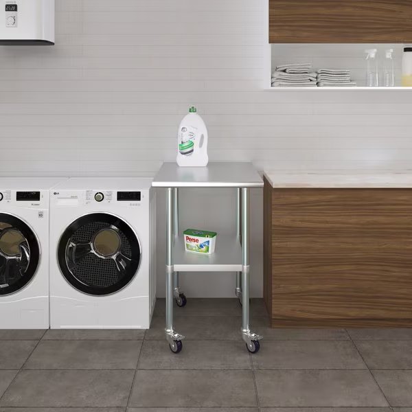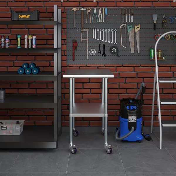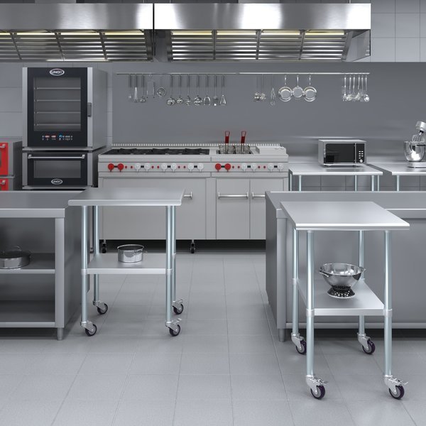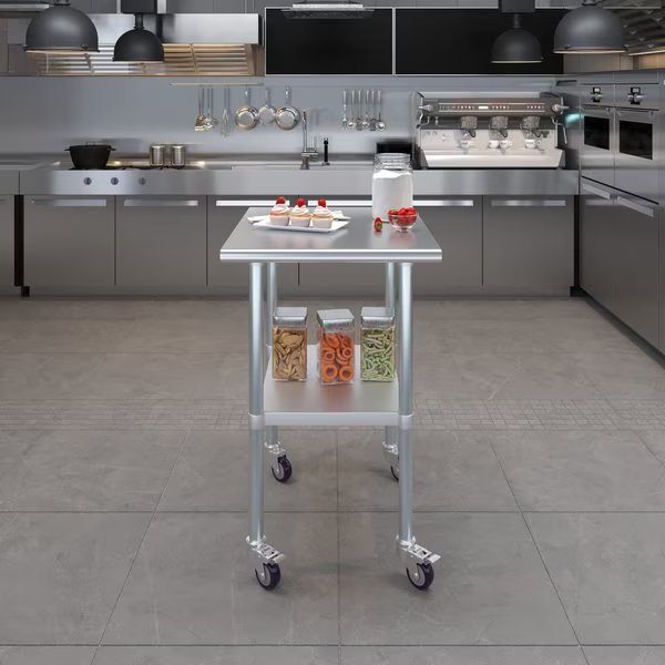 A Stainless Steel Utility Work Table with Wheels is a great addition to any home or business. It is perfect for a variety of tasks, including a workbench, prep table, or general-purpose table. The included bottom shelf provides additional storage space. Some assembly is required.NSF certification allows the table to be used in any food service environment.The table is made with corrosion resistant 430 stainless steel top and galvanized legs and bottom shelf. It's built to withstand heavy use and everyday wear and tear. Whether you need a sturdy workspace for your next DIY project or simply want an extra prep area in the kitchen, this utility table has you covered.Common Applications:Food Prep Table For Commercial KitchenKitchen IslandCounter ExtensionUtility Bench for ShopProfessional Work StationGarage Work BenchLaundry Clothes Folding TableBrewing SetupExam Table For VeterinariansButcher ShopProduct SpecificationsMobile stainless steel work table surface has curved edges for safety and comfort. It incorporates a heavy duty adjustable galvanized bottom shelf and leveling feet.18 Gauge 430 Stainless Steel TopGalvanized Adjustable bottom shelfAdjustable feet to compensate for uneven floorAdjustable under shelf - great for storageIncludes a set of 4 casters for easy mobility. Two of which are lockingHeight: 35 + 3 CastersNSF CertifiedSturdy & easy to setupHeavy Duty