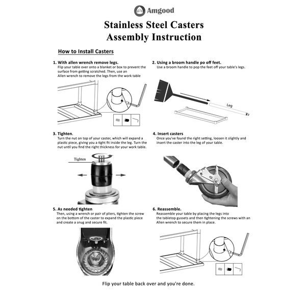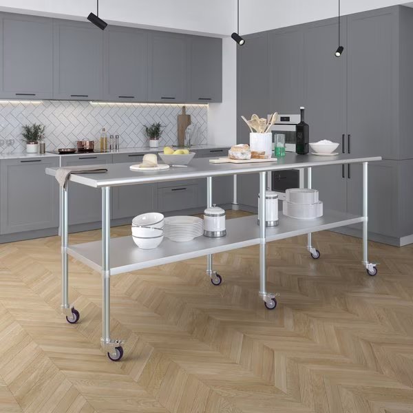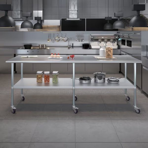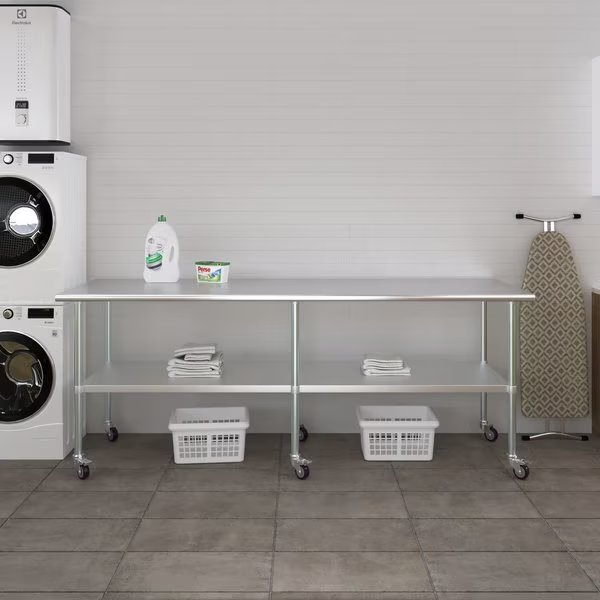 A Stainless Steel Utility Work Table with Wheels is a great addition to any home or business. It is perfect for a variety of tasks, including a workbench, prep table, or general-purpose table. The included bottom shelf provides additional storage space. Some assembly is required.NSF certification allows the table to be used in any food service environment.The table is made with corrosion resistant 430 stainless steel top and galvanized legs and bottom shelf. It's built to withstand heavy use and everyday wear and tear. Whether you need a sturdy workspace for your next DIY project or simply want an extra prep area in the kitchen, this utility table has you covered.Common Applications:Food Prep Table For Commercial KitchenKitchen IslandCounter ExtensionUtility Bench for ShopProfessional Work StationGarage Work BenchLaundry Clothes Folding TableBrewing SetupExam Table For VeterinariansButcher ShopProduct SpecificationsMobile stainless steel work table surface has curved edges for safety and comfort. It incorporates a heavy duty adjustable galvanized bottom shelf and leveling feet.18 Gauge 430 Stainless Steel TopGalvanized Adjustable bottom shelfAdjustable feet to compensate for uneven floorAdjustable under shelf - great for storageIncludes a set of 4 casters for easy mobility. Two of which are lockingHeight: 35 + 3 CastersNSF CertifiedSturdy & easy to setupHeavy Duty