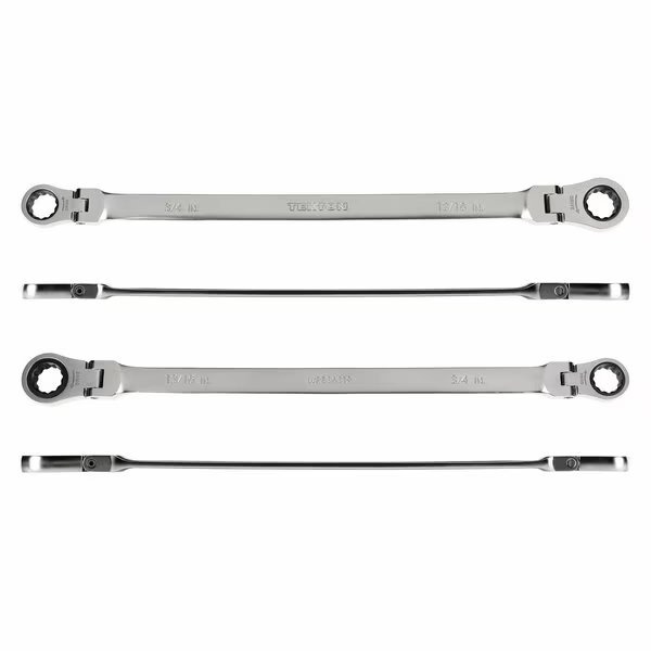 Each Tekton long ratcheting flex head wrench is permanently marked with both a high-visibility laser marking and a stamped marking for easy size identification. The 12-point box end fits multiple types of fasteners including 6-point, 12-point, and square. The flex head sweeps smoothly through 180-degrees without any set positions. This allows the wrench to operate at any angle and navigate around obstructions in its swing path, and the longer length offers added reach and increased leverage. The wrench is abrasive-blasted to create a finely textured finish and then plated with a trivalent chrome process, ensuring that the finish won't flake off or corrode over time.