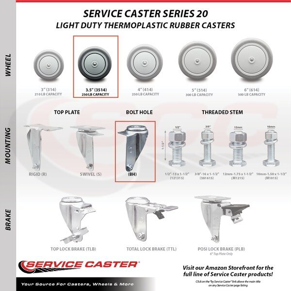 3.5 Inch SS Thermoplastic Rubber Wheel Swivel Bolt Hole Caster Set SCC, Service Caster, Mfr#: SCC-SSBH20S3514-TPRB-4