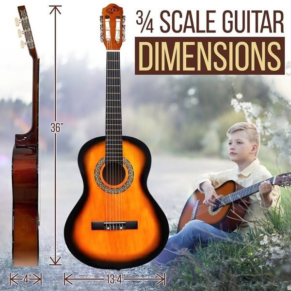 Features: - 3/4 Scale Size Guitar - Traditional / Classic Body Style - Hand-Crafted Wooden Construction - Protective Binding - High-Gloss Polished Body & Back - Machine Head: Chrome 3-in-Line - Dyed Wood Design, Rosette Linden Laminate Finish - Starter Guitar Design Perfect for Beginners & Children What's in the Box: - Guitar - Guitar Picks - Digital Guitar Tuner - Spare Guitar Strings - Travel / Storage Guitar Gig Bag - Detachable Guitar Shoulder Strap - Cleaning Cloth Digital Guitar Tuner: - Convenient Clip-on Design - Tuning Range: A0 - C8 (27.5 - 4186 Hz) - Response Time: Technical Specs: - Total Guitar Length: 36'' -inches - Scale Length: 22.83” -inches (580mm) - Total Body Length: 17.32” -inches (440mm) - Total Neck Length (Nut to Body): 18.5’’ -inches (470mm) - Headstock Material: Birch - Fretboard/Fingerboard Material: Dyed wood - Number of Frets: 18 Frets - Guitar Body Material: Linden Wood - Guitar String Material: Nylon String - Total Guitar Dimensions (L x W x H): 35.83" x 13.39" x 3.35" -inches