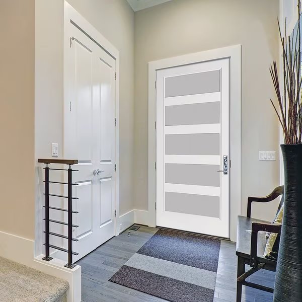 CODEL Doors' Fiberglass Front Doors are built to last and our contemporary door can add substanial curb appeal to your home. This smooth flush contemporary door with 6-lites of glass . The fiberglass doors are virtually maintenance free and won't dent, warp rot, or split. Our premium prehung door unit almost eliminates air and water inflitration with a variety of premium features. Door comes primed and ready to paint any color to match your home's style.