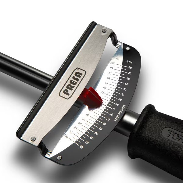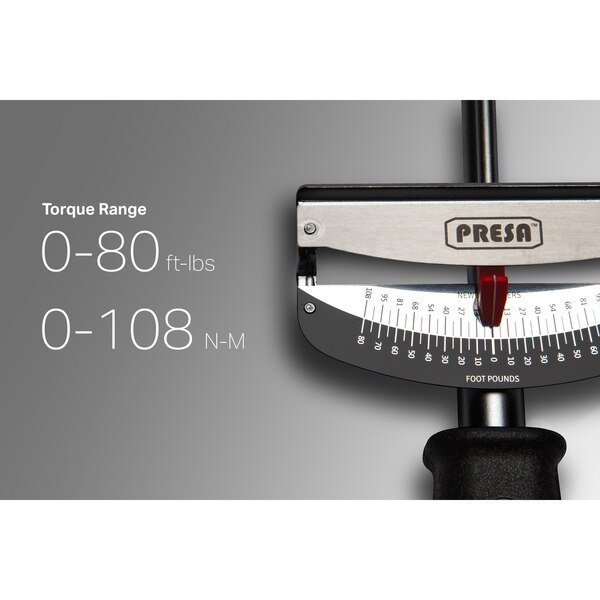 Get the most precise readings every time and get the job done better. This Presa beam style torque wrench has guaranteed precision. Perfect for accurately tightening and loosing nuts and bolts for all your vehicle and other appliances. This product features a 3/8 in. drive beam torque wrench with a graduated indicator tip to eliminate parallax error. The intuitive scale is calibrated in both directions from 0 - 80 ft. lbs. and 0 - 108 newton meters. The wrench is constructed with a powerful steel alloy and a durable corrosion-resistant mirror-chrome finish with an added textured black handle for the best grip possible.
