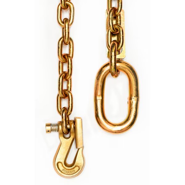 Agricultural Safety Chain for Towed Machines is a required "safety backup" for tractor-to-implement connections. The safety chain maintains the connection between the tractor and the implement if the primary connection fails at any point. KingChain Safety Chains are made to the highest production and quality control standards and will will work properly if and when they are needed. Manufactured from Grade 70 Transport Chain, one end features a 3/8 in. Clevis Grab Hook with a spring-loaded latch and the other has a 5-3/4 in. curved Grade 70 ring for the attachment loop to the drawbar or other attachment point. The chain has a permanent metal tag showing its weight rating, so there will never be any doubt.