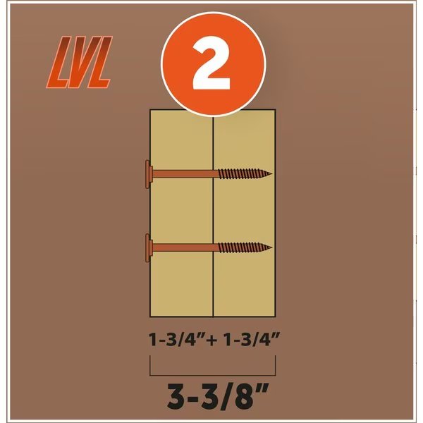 PWR DRIVE LVL is designed specifically for LVL beams, commonly used in new building structures, and will yield maximum assembly strength with this material. LVL beams have a different thickness than regular dimensional lumber: 1-3/4 in thickness instead of the usual 1-1/2 in. You can cover all possible assembly combinations in a structure with only four different lengths of the PWR DRIVE LVL: 2, 3, or even 4 member assemblies. That means fewer screws are necessary to assemble anything you may encounter on the jobsite. Each PWR DRIVE LVL pack has a handy reference guide for proper LVL screw selection according to the assembly combination in question.