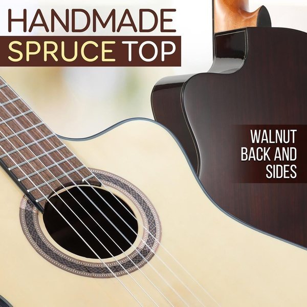 Features: - 39” Size Guitar, cutaway body - Traditional / Classic Body Style - Spruce plywood top, walnut plywood back and side - Black walnut fingerboard and bridge, with carbon rod reinforcement neck - ABS binding with multi-ply inlay - High quality machine head - With SAVAREZ strings 500 CJ What's in the Box: - Guitar - Guitar Picks - Digital Guitar Tuner - Travel / Storage Guitar 3mm thick bag - Guitar stand - Foot Stool Digital Guitar Tuner: - Convenient Clip-on Design - Tuning Range: A0 - C8 (27.5 - 4186 Hz) - Response Time: Technical Specs: - Total Guitar Length: 39'' -inches - Scale Length: 25.7” -inches (652mm) - Fretboard/Fingerboard Material: walnut - Number of Frets: 18 Frets - Guitar Body Material: Spruce plywood top, walnut plywood back and side - Guitar String Material: Nylon string - Total Guitar Dimensions (L x W x H): 39" x 13.9" x3.9" –inches