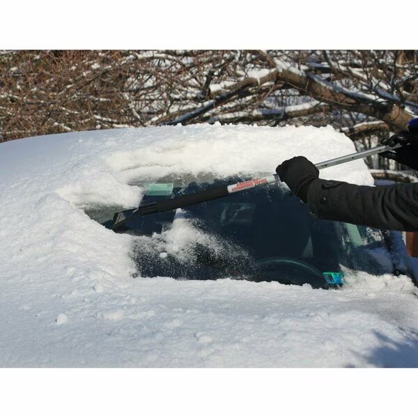 Blast through winter ice with the Bigfoot 42in Telescoping Snowbroom and Ice Scraper with Pivoting Head!This amazing ice scraper is perfect for the car or truck. While it packs down to a couple feet for convenient storage, it fully extends to 42in for a big reach across windshields on even large road vehicles. There's no need to have a big bulky scraper in the trunk or backseat with this snowbroomMade from a safe and durable polyethylene and aluminum, this ice scraper is safe to use on glass without gouging. It features two different heads to tackle all your snow scraping issues. The soft, yet firm, bristles knock away thick layers of snow and loose accumulation. This head can also be rotated a full 90 degrees in either direction for pulling snow at awkward angles with ease. Flip the brush over and you can really go to town with the wide scraping edge. The edge is reinforced so you can really push hard without breaking. The whole snowbroom is weather-resistant and will stand the test of time. The handle features a brightly colored, foam grip that is easy to grasp and allows you to leverage the snowbrush with ease while you knock away ice and snow.EMSCO Group is the original manufacturer of the plastic snow shovel and continues to lead the way in developing and innovating winter and cleaning products. Get your Bigfoot 42in Telescoping Snowbroom and Ice Scraper today!