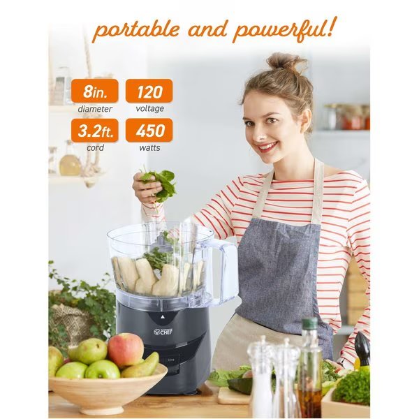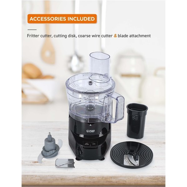 INCLUDED ATTACHMENTS: This electric food processor includes accessories for a variety of food prep needs including chopping, mixing, mincing, slicing, & shredding. Accessories include a fritter cutter, reversible cutting disk, coarse wire cutter and S-blade attachment. WIDE 70MM FOOD CHUTE: Our COMMERCIAL CHEF kitchen food processor features a large 70mm food chute with food pusher for safe and easy feeding. Large opening accepts large cuts of fruit, cheese, vegetables and more without having to remove the lid. EASY 2-BUTTON CONTROL: Simple ON & OFF/PULSE button control for ease of use. Powerful 450 watt motor with Pulse feature gives you the power you need for a multitude of recipes.