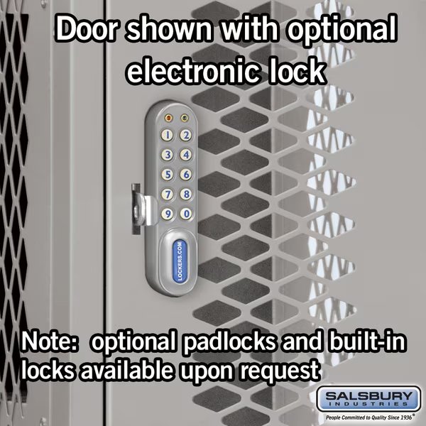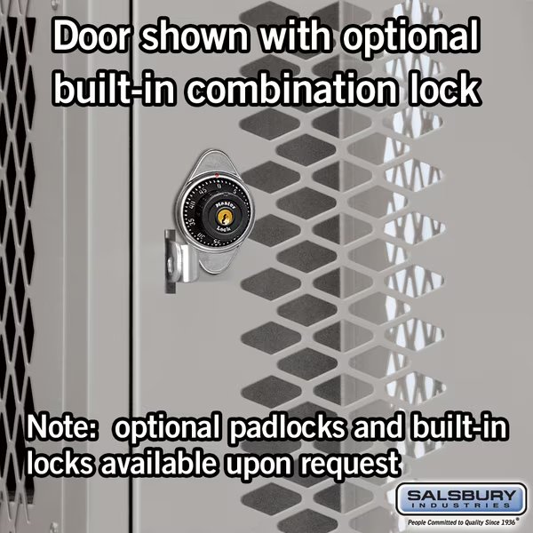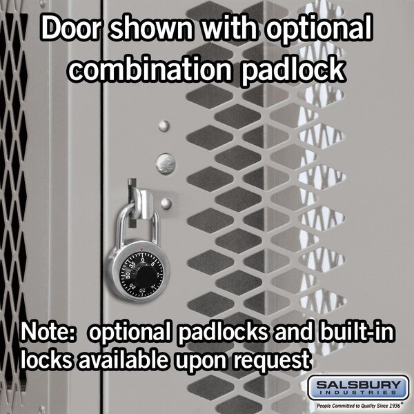 Constructed of 16 gauge steel, Salsbury 75000 and 76000 series 12" wide box style vented lockers effectively combine visibility and maximum air flow with security. Vented lockers are ideal for dressing rooms, locker rooms and athletic clubs. Offered in a gray, tan or blue powder coated finish and as unassembled or assembled units, vented lockers are 12'' wide (one wide) and 36" wide (three (3) wide) with an overall height of five (5) feet and six (6) feet (add 6'' for legs). The individual compartments are 12'' W x 12'' H and available in depths of 12'', 15'' and 18''. Sloping hoods, finished end panels, end bases, front bases, compartment shelves, fillers and lockers without legs are available as options upon request.