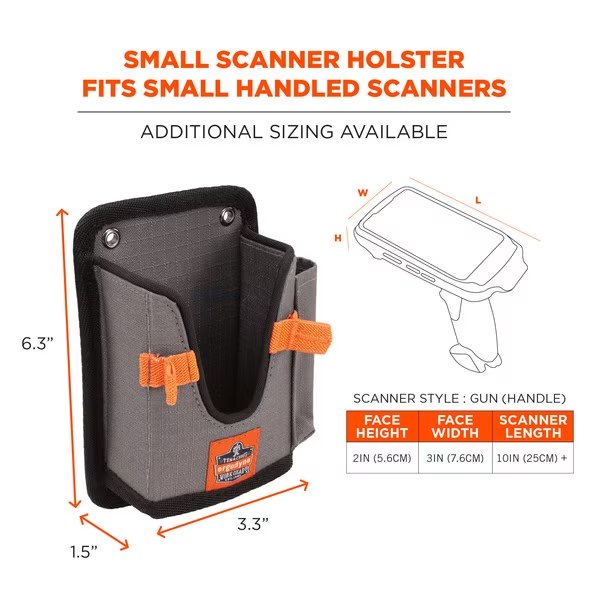 This barcode scanner mount is available in 2 sizes to fit a variety of barcode scanners, QR scanners, UPC scanners, inventory scanners and more. The small holster fits scanners measuring 10+in L x 3.25in W x 2in H // 25.4+cm L x 8.2cm W x 5cm H. The large holster fits scanners measuring 10+in L x 3.5in W x 3in H // 25.4+cm L x 8.8cm W x 7.6cm H.