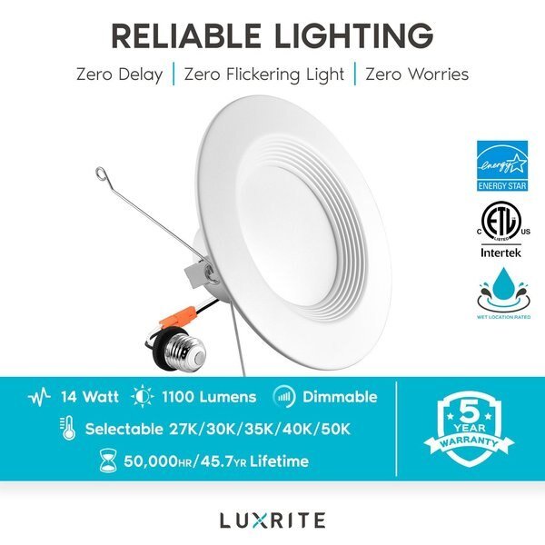 Luxrite Recessed Lighting with 5 Color Temperature Switch - The perfect solution to those that want the ability to pick the correct light for your home or business. With these Luxrite LED recessed ceiling lights, you are offered 5 color temperature options to choose from with an easy to use switch attached to each down light. Choose from 2700K warm white, 3000K soft white, 3500K natural white, 4000K cool white, or 5000K bright white with just a simple adjustment. Built with a lightweight design, each LED can light is easy to handle and install into your 5 or 6 inch can housings. Just using the E26 adapter to screw in your lights and push the fixture into the housing with the metal tabs for a flush to ceiling finish. You'll be able to use these downlights indoors and outdoors since each fixture is wet location rated to handle rain and damp areas, so feel free to install in soffits, eaves, or even showers. Control the light output with it's smooth dimming capabilities which can go from 100% to 10% light, giving you a comfortable space every time.