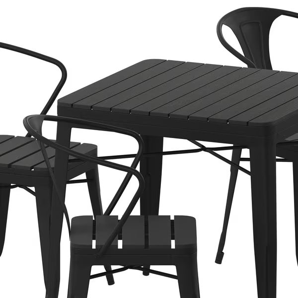 Modern style and materials combine to form this stunning all-weather, 5 piece patio set featuring 4 stackable patio chairs and a square table ideal for home or business use. The weather and rust resistant steel chair frames boast vertical slat backs and are paired with poly resin slats on the seats allowing for year-round use perfect for commercial outdoor dining areas as well as your backyard patio and stack up to 8 chairs high for storage. Underseat cross bracing makes these chairs capable of supporting up to 400 lbs. static weight capacity each. The matching table is also rust resistant, has cross bracing for sturdiness, and a poly resin slatted top that won't rot, chip, or peel. All pieces boast fixed floor glide to prevent damage to indoor flooring surfaces. The set of 4 chairs arrives fully assembled while the table assembles in 10 minutes or less for quick setup. Cleanup is quick and easy with a damp cloth.
