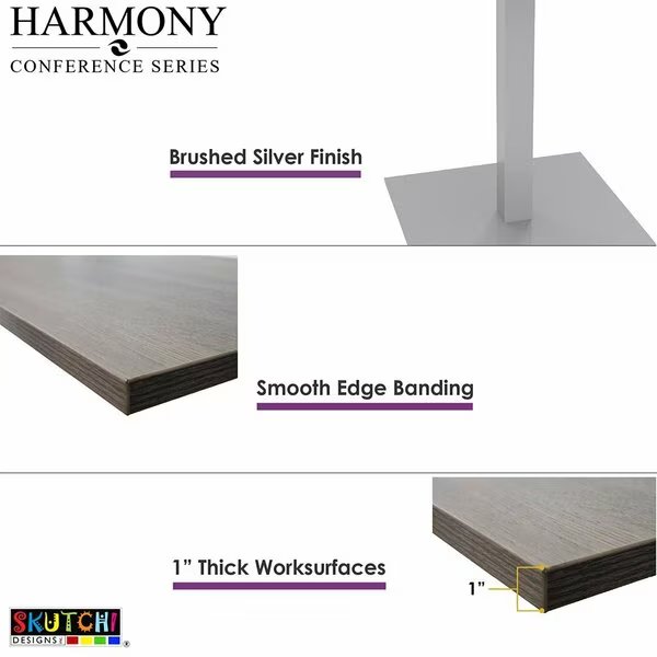 Skutchi Designs Inc. literally brings people to the table with our Harmony Conference Series tables. These tables are built to impress with a variety of sizes, shapes, laminates to make them as utile as they are stylish. Bring a new level of flair and quality to your staff or board meetings, and showcase the best your business has to offer to new and existing clients with this elegant conference table solution. The Harmony Conference Table Series offers this six-person Racetrack shaped conference table. It measures approximately 6' in length, 3' in overall width, and the overall height is 29.5. It can comfortably seat up to six people depending upon the chairs you pick. Our Harmony Series features modern conference tables designed to look sleek and stylish for any meeting room, or even breakroom. This conference table is the perfect representation of modern simplicity. It's helpful to have a large clean-lined office table in a space where everyone can gather around and review goals and objectives. Get rid of excess wires by adding a data/electrical module to your conference table. Featuring 2 power outlets, 2 USB ports and 1 data port, thos electrical unit will help streamline your meeting room setup.Because our conference tables are commercial-grade and constructed from eco-friendly materials, they make them one of our top-selling products. We use the highest quality materials for our Harmony Conference Series tables.Sturdy steel frame and durable scratch-resistant wood-look top provides style and stability. This modern conference table is built to last and is sturdy enough to hold all of your items. Our Harmony Conference Series tables are easy to assemble. Clear assembly instructions are included in the package.