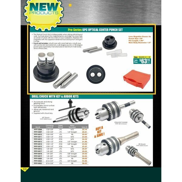 6 Piece Optical Center Punch Set Punch set includes 6 components: a bullseye lens, a cross hair lens, a 150 degree center punch made of tempered steel, a 60 degree center punch made of tempered steel, a precisely manufactured aluminum main body and a fitted storage case. Punch size is 3/8 in.. Pin length is 1.85 in.. Acrylic lens magnifier power is 9x. Allows you to punch layout points within .002 in. of location easily. The cork bottom helps to provide stability and grip. It reduces slippage and ensures that the center punch remains in position while marking the material accurately. Even the inexperienced can punch accurate holes every time with this set. It is indispensable when doing critical layout work. It is also ideal for metalworking, woodworking, jewelry making, and other precision crafts. Just look down the magnifying lens and align the cross hairs with the mark on your work piece. Replace the magnifier with the supplied punch and give it a tap.