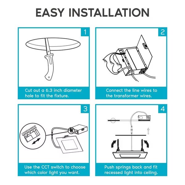 - •5 COLOR OPTIONS - Not sure what color temperature you are looking for in your home when using LED recessed lights? Each 6 inch square LED ceiling light has a simple to use switch connected to the junction box that can change your lights to 2700K warm white, 3000K soft white, 3500K natural white, 4000K cool white, or 5000K bright white. Your home wafer lights will be adjustable through 5 color temperatures until you find the perfect light to select for your space.