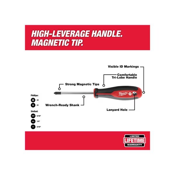Tether Ready Magnetized Tip Screwdriver Set, Tip Finish Chrome, 1/4 in, 3/16 in, 5/16 in, Phillips, Slotted, Ergonomic, Number of Pieces 6, No, ESD Safe No, Non-Sparking No, Measurement Type SAE, Includes (3) Phillips Screwdrivers: #1 x 3 in , #2 x 4 in , #2 x 6 in , (3) Slotted Screwdrivers: 1/4 in x 4 in , 3/16 in x 6 in , 5/16 in x 6 in , Corrosion Resistant Yes, Tether Ready Yes, Range of Shank Lengths 3 in to 8 in