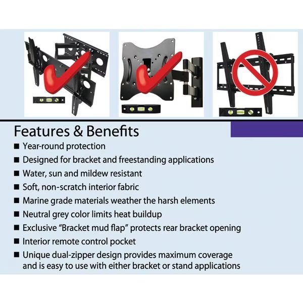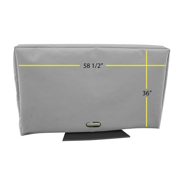 You can enjoy watching TV on your deck, by your pool, from your hot tub, or anywhere outdoors with the Solaire 60 In. to 65 In. Outdoor TV Cover. You'll know your TV is protected in any weather. Give your electronic investments ideal protection from the elements with this durable TV cover made from the finest marine grade elements. Measure your TV for the best fitting cover. This cover is 58 in. wide by 36 in. high by 4.5 in. deep.