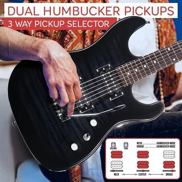 Features: - Standard Full-Size Guitar - 6-String Traditional Electric Style - Hand-Crafted Wooden Construction - Adjustable Rotary Controls, Volume & Tone - Chrome-Accent Hardware & Tuner Pegs - High Gloss Coating & Polished Guitar Body / Back - Color: Black, Glossy Finish - Pickup: 2x Humbuckers - Controls: (1) Volume, (1) Tone - PU selector: 3-ways - Scale: 25.5'' -inches, 22F - Bridge: Classic S Style Tremolo - Machinehead: Diecast, Chrome - With Guitar Cable, Allan key and Tremolos Rod Amplifier Features: - 10W Amplifier, Black - 5’’ Loudspeaker - Specially Designed for Enhanced High-Frequency Response - Functions: Input, Drive Switch, Volume, Treble, Bass, Headphone Output - Portable and Lightweight for Easy Transport - Includes Headphone Output for Silent Practice - Cabinet Material: Lightweight Plywood, Coated by High-Quality Leather What's in the Box: - 6-String Electric Guitar - 10w Amplifier - 98.4’’ -inches Guitar Cable - Allan Key and Tremolos Rod - Gig Bag - (6) Spare Electric Guitar Strings + Extra 1st String - Detachable Shoulder Strap - Digital Tuner - (3) Pearloid Picks Digital Guitar Tuner: - Convenient Clip-on Design - Tuning Range: A0 - C8 (27.5 - 4186 Hz) - Response Time: Technical Specs: - Total Guitar Length: 39.4” -inches - Scale Length: 25.5'' -inches - Number of Picks: 3 pcs. - Felt Picks Dimension: 0.035’’ Thickness (0.9mm) - Neck Material: Canadian maple - Fretboard/Fingerboard Material: High-Density Man-made Wood - String Material: Steel - Number of Frets: 22 Frets - Guitar Body Material: Solid Paulownia Wood with Decal Paper Veneered on the top - Guitar String Material: Steel Alloy - Total Guitar Dimensions (L x W x H): 39.4'' x 12.8'' x 3.6'' -inches