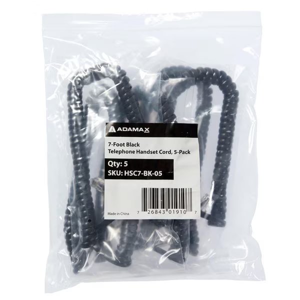 7 ft Uncoiled/1.33 ft Coiled Telephone Handset Cord, With RJ9 (4P4C) Connectors, Black, 5PK, Newhouse Hardware, Mfr#: HSC7-BK-05
