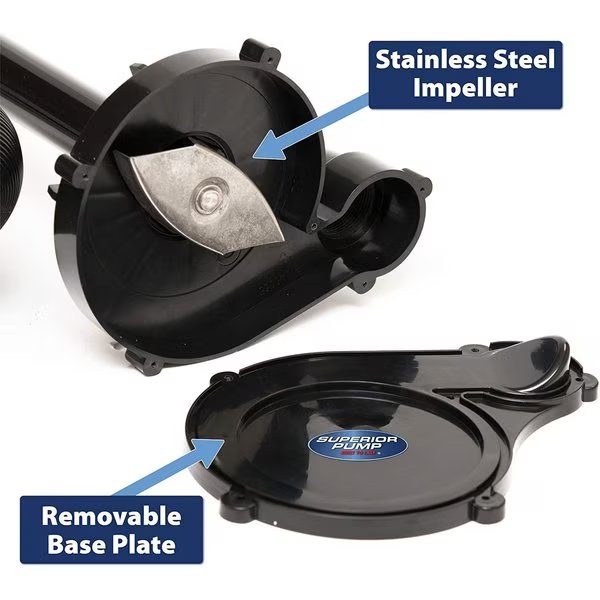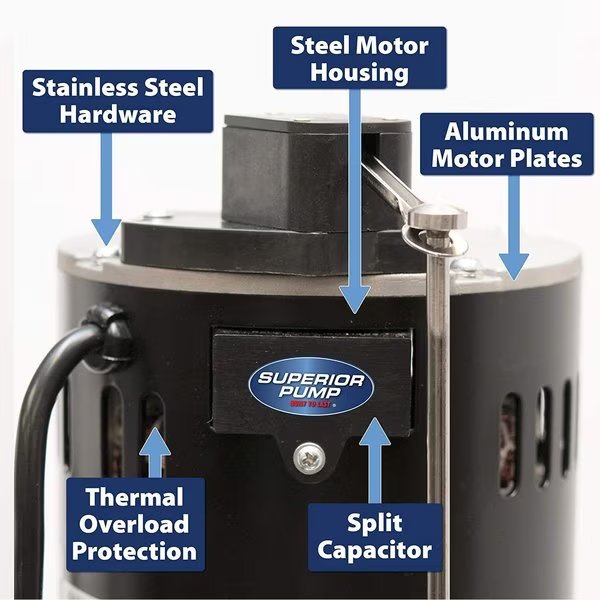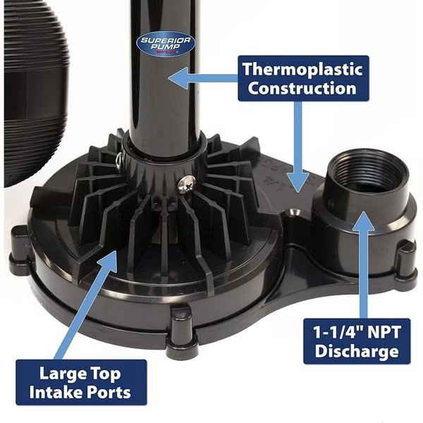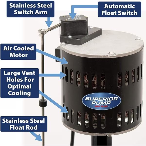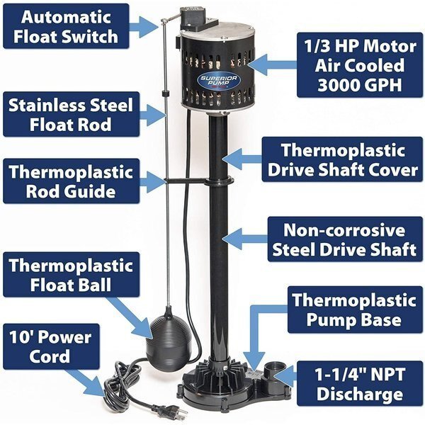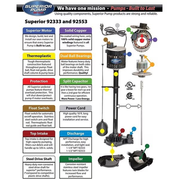 Superior Pump builds pumps that are truly Built to Last and are 100 percent factory tested. Superior Pump pedestal pumps use quality components including solid copper motor windings, electronically controlled split capacitors, heavy duty drive shafts, stainless steel impellers and 10 foot power cords. Superior Pump model 92333, 1/3 HP thermoplastic pedestal sump pump, will move water up to 3000 gallons per hour. This pump features a corrosion resistant steel drive shaft, stainless steel impeller, and metal switch arm for strength and durability. This pump is UL/CUL listed and CSA certified.