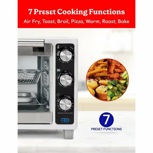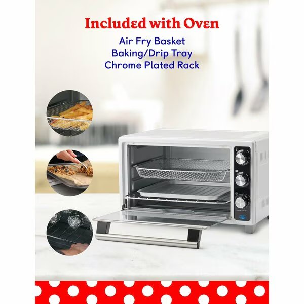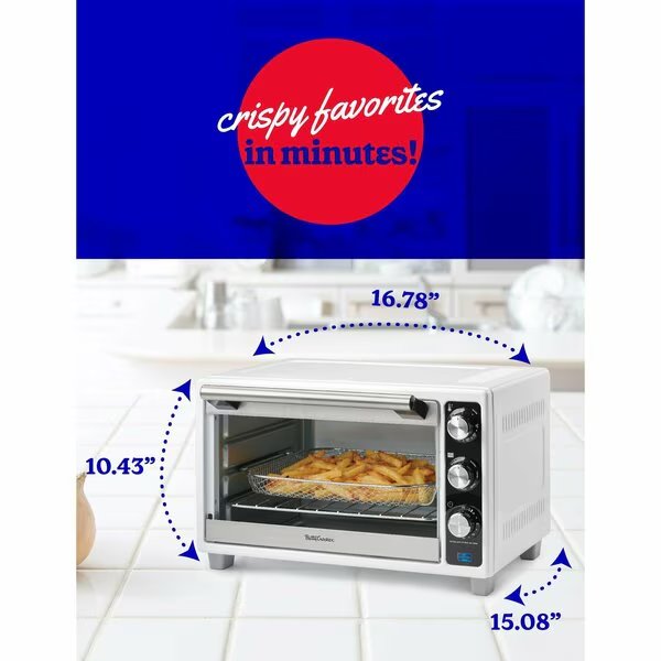 Make crispy favorites in minutes! Betty's 6-slice air fryer toaster oven combo accommodates a variety of food for preparing appetizers and snacks to delicious French fries and chicken wings. This Betty Crocker Air Fryer Convection Oven adds a healthier alternative to traditional deep frying food by using little or no oil necessary. Not just an ordinary toaster, this countertop convection toaster oven is equipped with 7 preset functions including Air Fry, Toast, Broil, Pizza, Warm, Roast & Bake. This toaster oven air fryer combo comes with an air fry basket, baking pan, drip tray and a chrome plated wire rack that is adjustable to 3 different positions. Our convection oven countertop toaster air fryer uses cyclonic hot air flow technology that circulates hot air within the oven to achieve golden, crispy results for fries, chicken tenders, bacon and more in just minutes. Our large toaster oven offers a 0.8 cu. ft. / 22-liter capacity that can toast up to 6 slices at once. Portable oven features a cool-touch handle with stainless steel insert. Other features for our electric oven include temperature adjustment control from 212-446 degrees Fahrenheit 100-230 degrees Celsius, a 60-minute timer with signal bell, auto shutoff and a blue power indicator light. Brushed stainless steel exterior. 1500 watts.