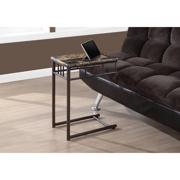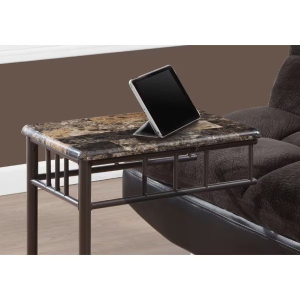 What a convenient way to eat or drink on your couch! This classic rectangular snack table with an espresso marble-look top has sufficient space to place your tablet, laptop, snacks, drinks and even meals. The bronze metal base provides sturdy support along with an elegant touch and is designed to easily slip under your sofa.. Contemporary style with an elegant espresso/beige marble-look top. Designed to easily slip under your sofa. Ideal surface for a laptop/tablet, snacks, drinks or meals. Sturdy metal base in a bronze finish.