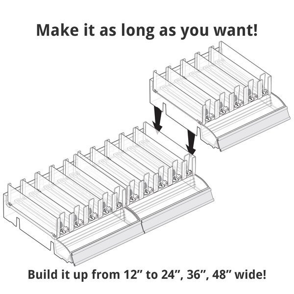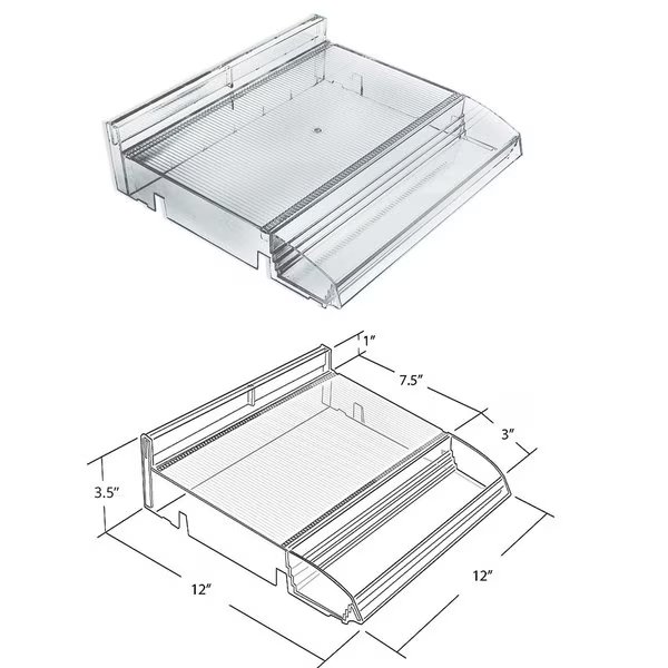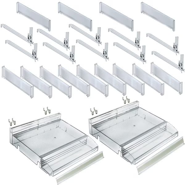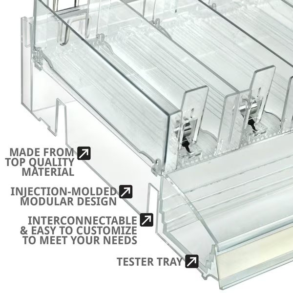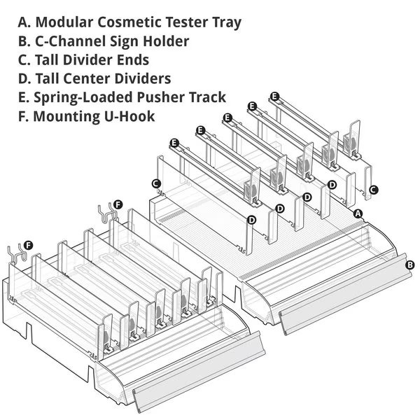Azar Displays Divider Tray with Attached Tester Tray is a game-changer for the retail industry. The dividers are adjustable to allow products of all shapes and sizes to fit into this display. Simply snap in the center dividers and end dividers to the exact size of your product. Add the included Spring Pusher Tracks to keep your product pushed up front and always clearly visible. The tray has an attached Tester Tray on the front (not removable) that measures 12” wide x 3” deep and allows customers to see and feel product before they purchase. Each kit includes dividers and pushers to make up to 10 rows of product, 5 rows on each Tray. Compartment size will depend on your specific needs, you can customize the slot to the size of your product. The merchandiser tray is designed with an interlocking system to connect additional trays, giving the ability to create a long shelf of these trays. This kit also includes 4 U-hooks that can hang onto any pegboard and most slat walls giving plenty of flexibility of how and where this product can be used. The cosmetic shelf sits at a 90 degree angle off the wall. The tray bin can sit on a counter as well. This cosmetic kit with tester also includes 2 graphic c-channel holders to adhere to the front for displaying brand name, color swatches or product titles. This retail display tray kit is the right choice for merchandising perfumes, creams, eyeshadows, nail polishes, lip gloss, mascara, essential oil droppers, hand sanitizers, cosmetic assortments, boxed products, and more! The Tray is available in Clear, and the Clear Dividers are available in Short or Tall.