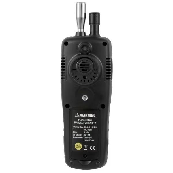 Particle Counter Dust Measuring Device Handheld laser particle counter for monitoring cleanroom particulate concentrations, indoor air quality, and exposure to dust This is a handheld laser optical particle counter. Measures 6 sizes of particles: 0.3 μm, 0.5 μm, 1.0 μm, 2.5 μm, 5.0 μm, 10 μm. Offers a robust 80 MB internal memory and microSD card slot. Features a large, full-color LCD display with a backlight. Includes a built-in camera for image and video recording.