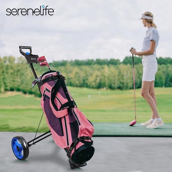 Features: - New Deluxe 2-Wheel AIuminum 2-Wheel Pull Cart - Lightweight and Foldable Golf Trolley - Includes Foot Brake for Rear Wheel - Upper and Lower Bracket with Elastic Strap - TPE Handle Grip - Push Button System - Ergonomic Padded Adjustable Handle - Simple Quick Braking System - Durable and Compact Size for Easy Storage and Transportation - Easy to Fold and Unfold - Designed for Multiple Pushing Positions - Umbrella Holder Not Included - *Assembly Needed What's in the Box: - (1) 2-Wheel Golf Push Cart Technical Specs: - Construction Material: Aluminum Frame - Max. Load Capacity: 33 lbs. - Rear Wheels Size: 9.5'' -inches - Folded Product Dimension (L x W x H): 19.1'' x 14.6'' x 22.8'' -inches - Unfolded Product Dimension (L x W x H): 44.7'' x 28'' x 47.8'' –inches